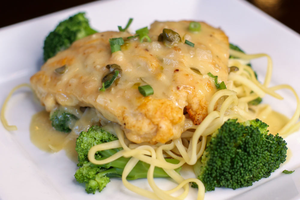 with linguine, lemon caper sauce and seasoned broccoli
